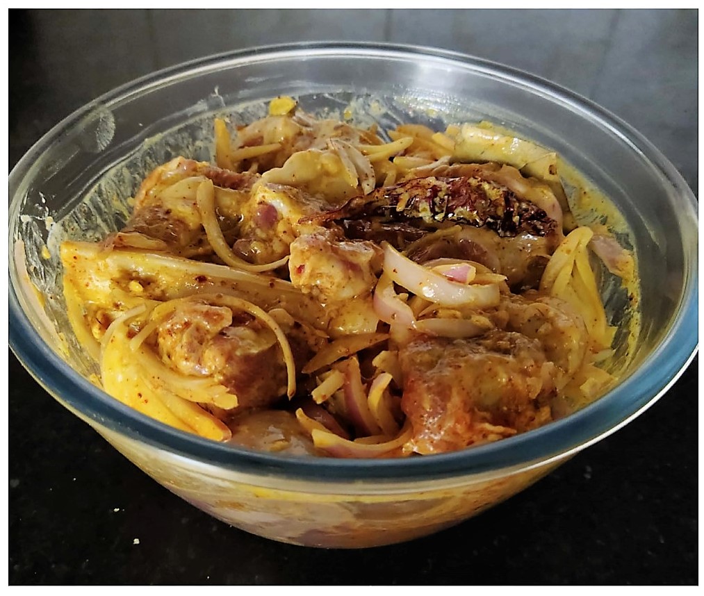 - Mix all the ingredients well with the mutton, cover it and refrigerate this marinade for 1-2 hours (this will allow the mutton to absorb all the flavors of the spices)