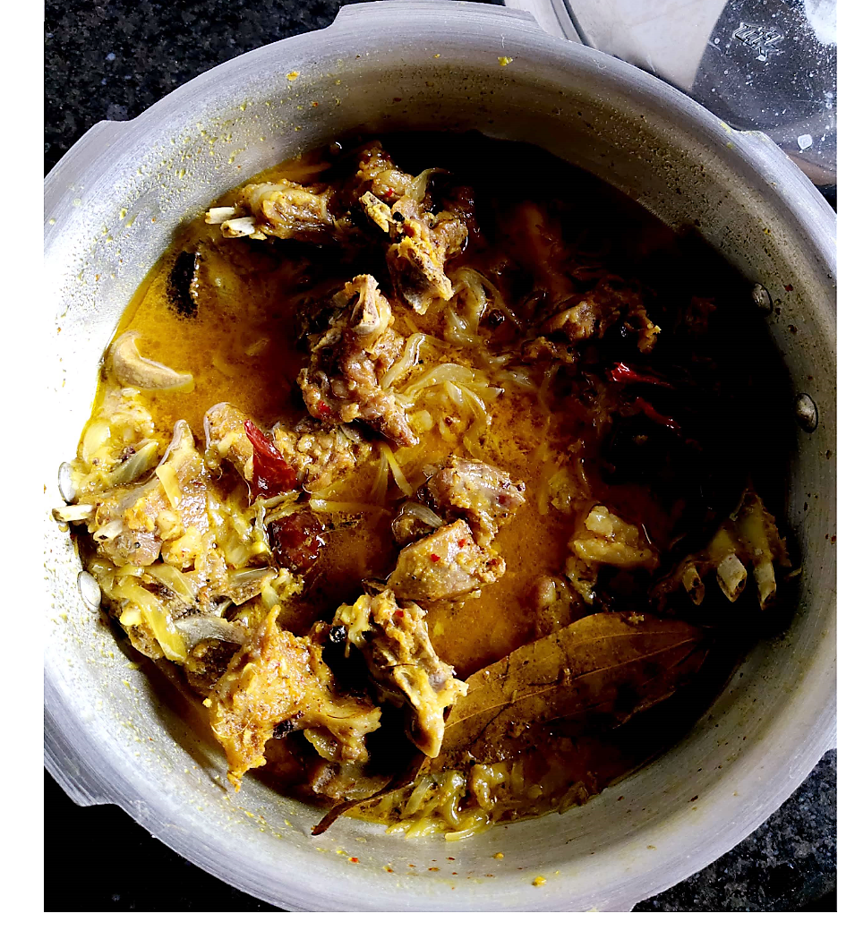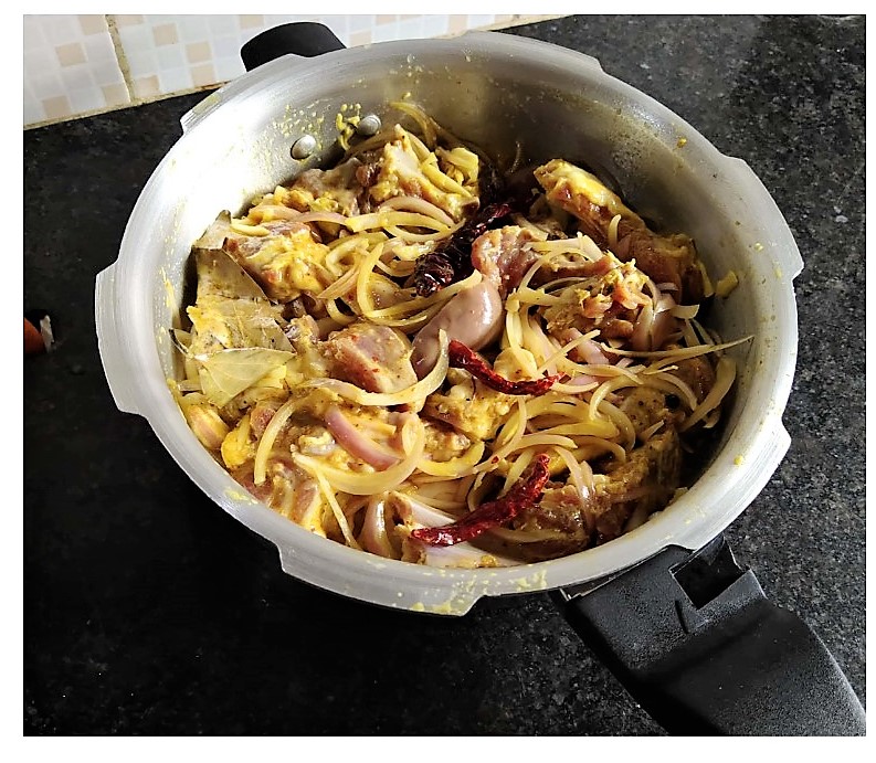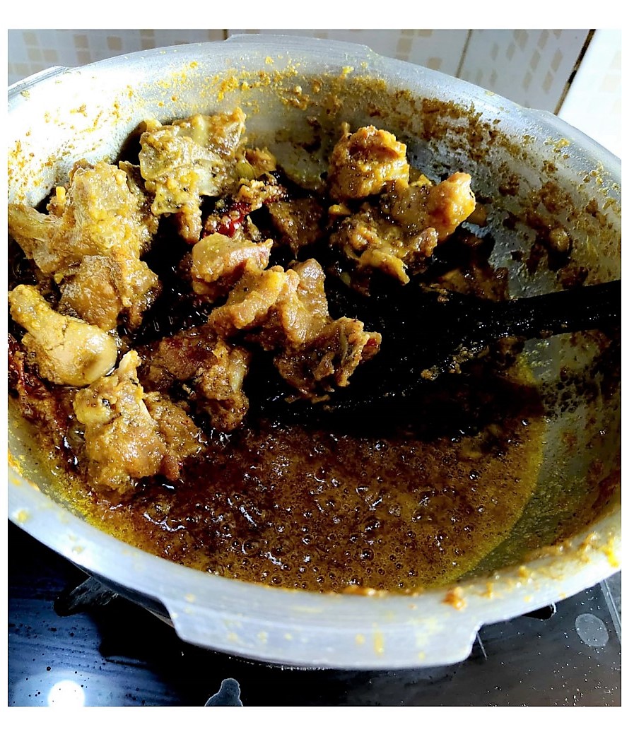 - Place the open pressure cooker back on the oven and start stirring the mutton till the gravy is absorbed (the mutton with the spices starts drying up)