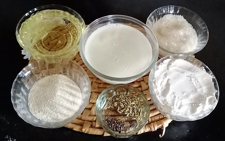 - In a bowl add maida, suji and sugar; mix the dry ingredients and then add 2 tablespoons of oil to this dry mixture; give the ingredients a good mix with the oil