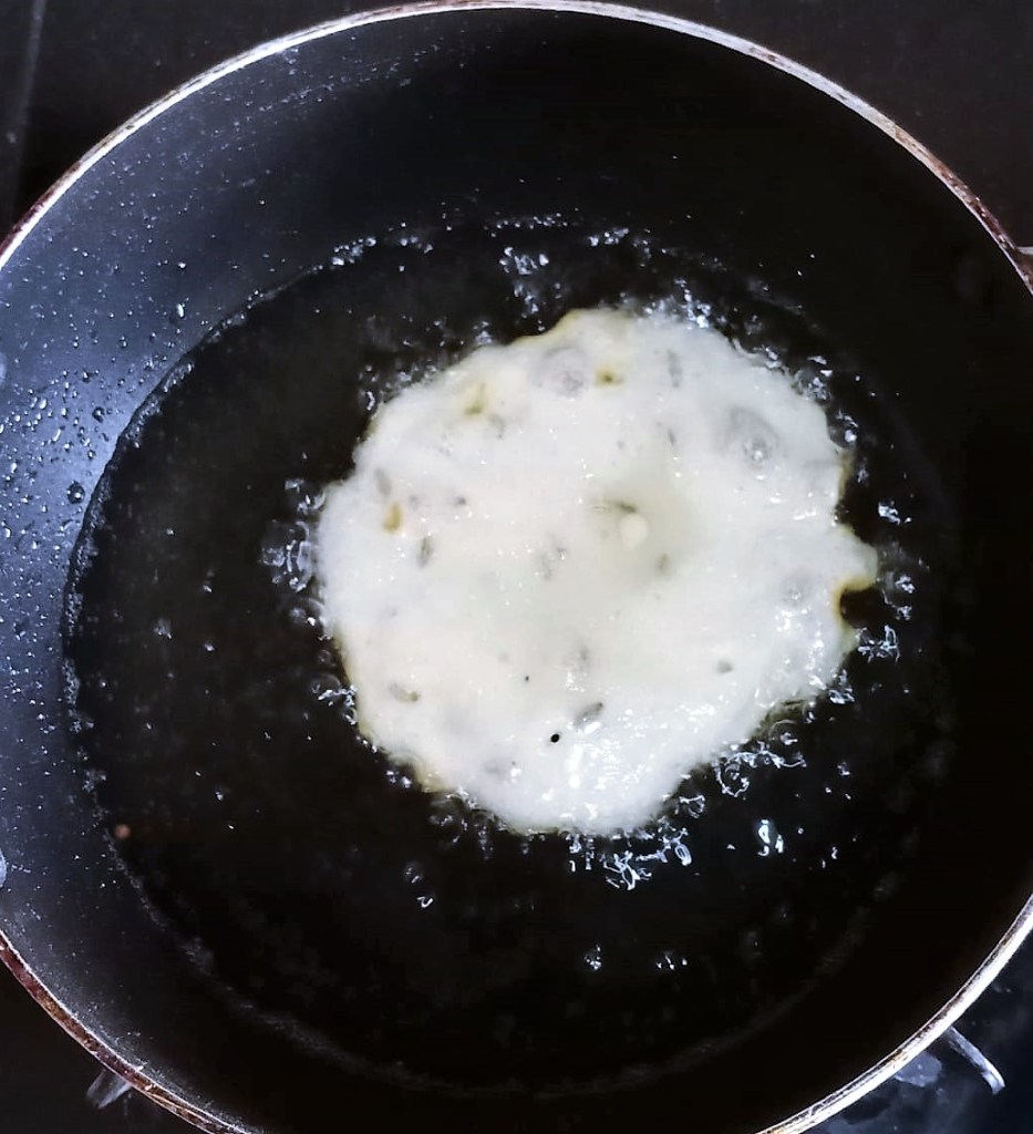 - Once the oil is hot, use a ladel to pour a small quantity of the mixture in the oil