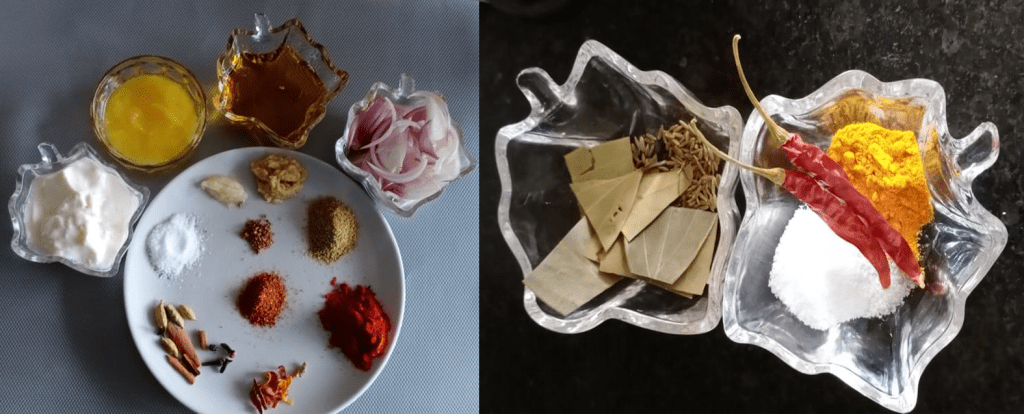 - Roughly crushed whole garam masala (Cinnamon, Mace, Cloves, Green Cardamom, Bay Leaves, Whole black pepper, Cumin Seeds, Nutmeg Powder)