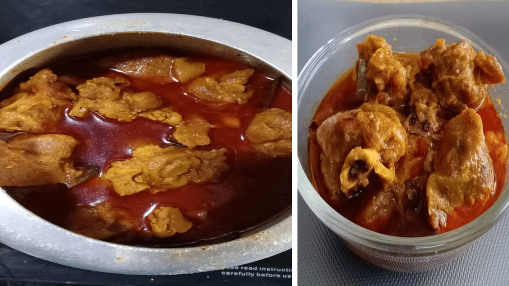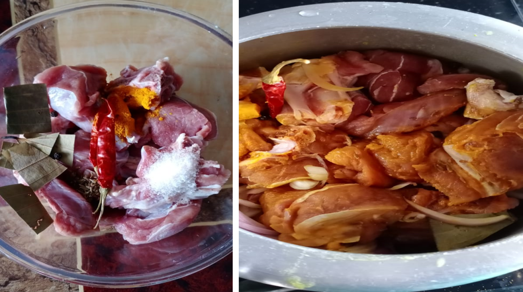 - After 2 whistles, remove the mutton from the oven and let it cool down